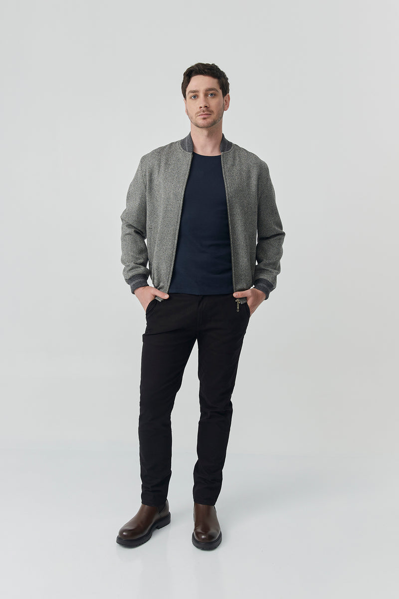 The Bomber Sam is crafted from a gray herringbone tweed, woven in fine merino wool that provides structure, softness, and natural warmth. Its design fuses the tradition of classic tailoring with a contemporary, relaxed silhouette, reinterpreting timeless elegance with a modern attitude.