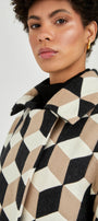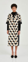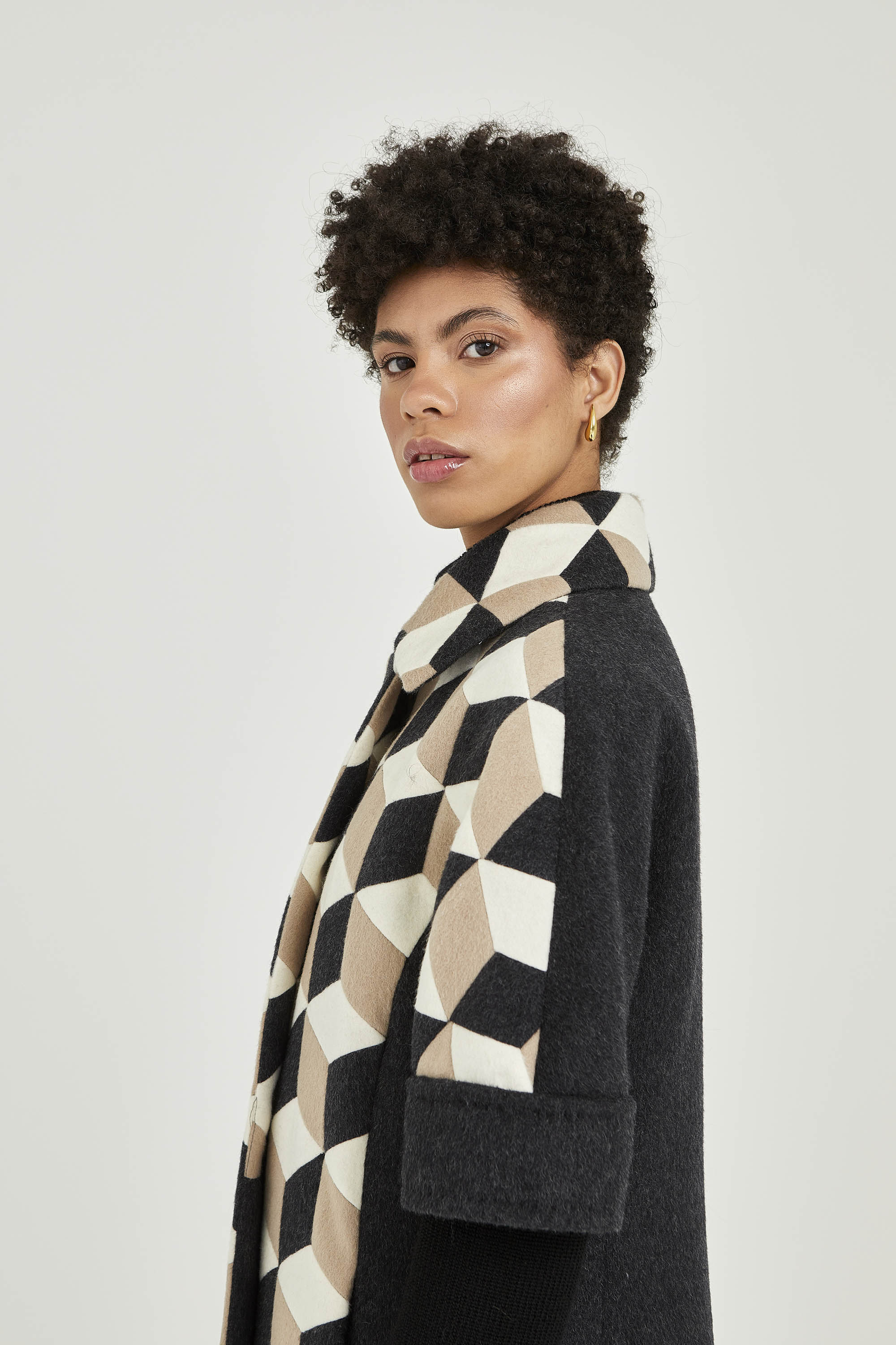 Short sleeve coat with three-dimensional cube design. The development of the fabric is assembled by hand to generate a conscious design from small pieces of alpaca fabric, using tessellation technique. The model has two hidden buttons and a button on the collar to show off a closed collar. Unique piece, limited edition.