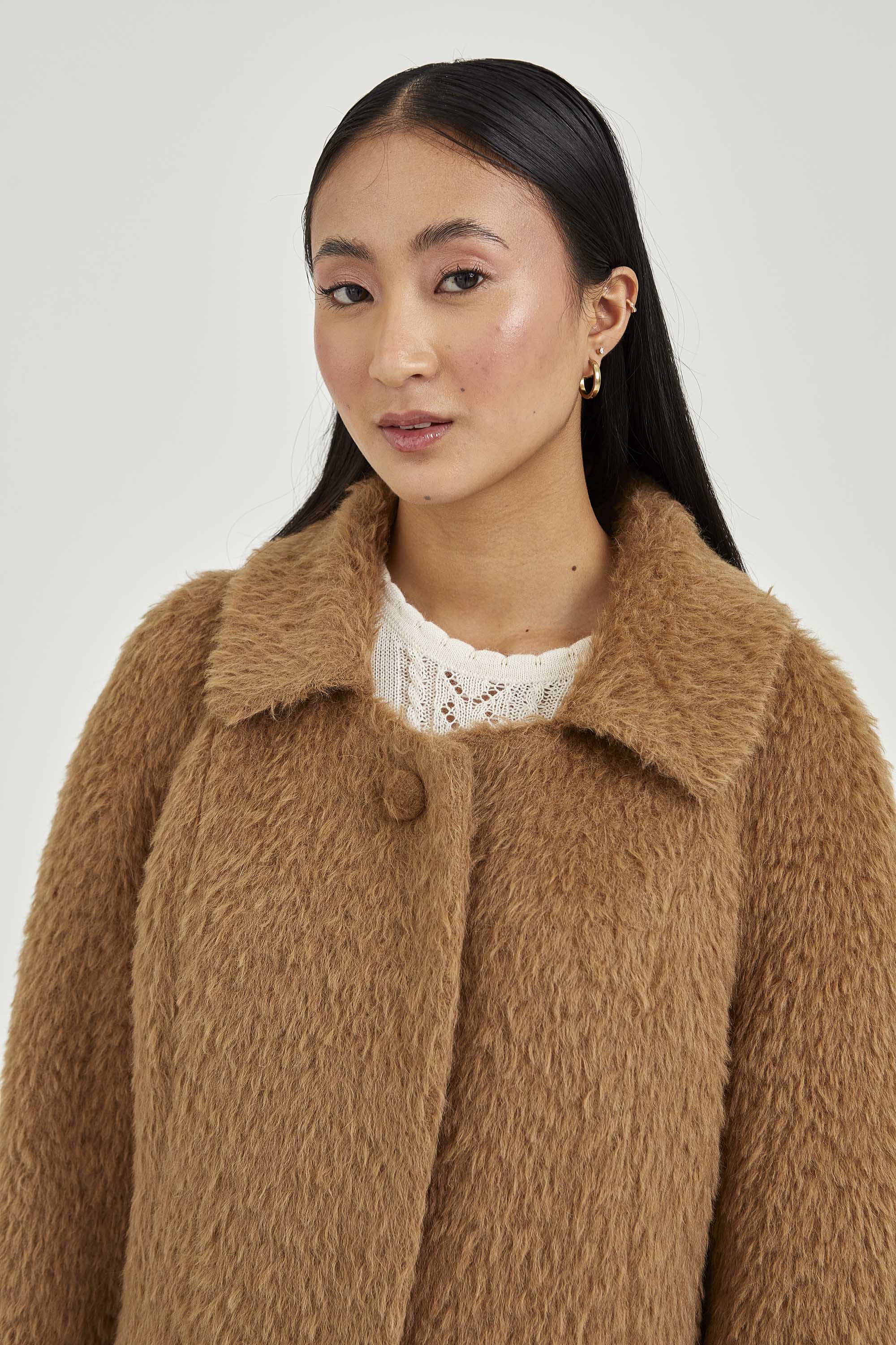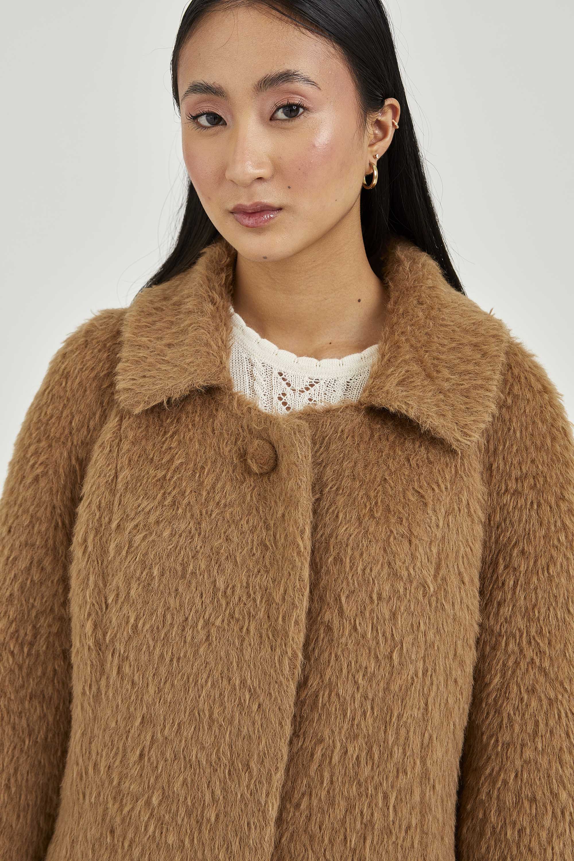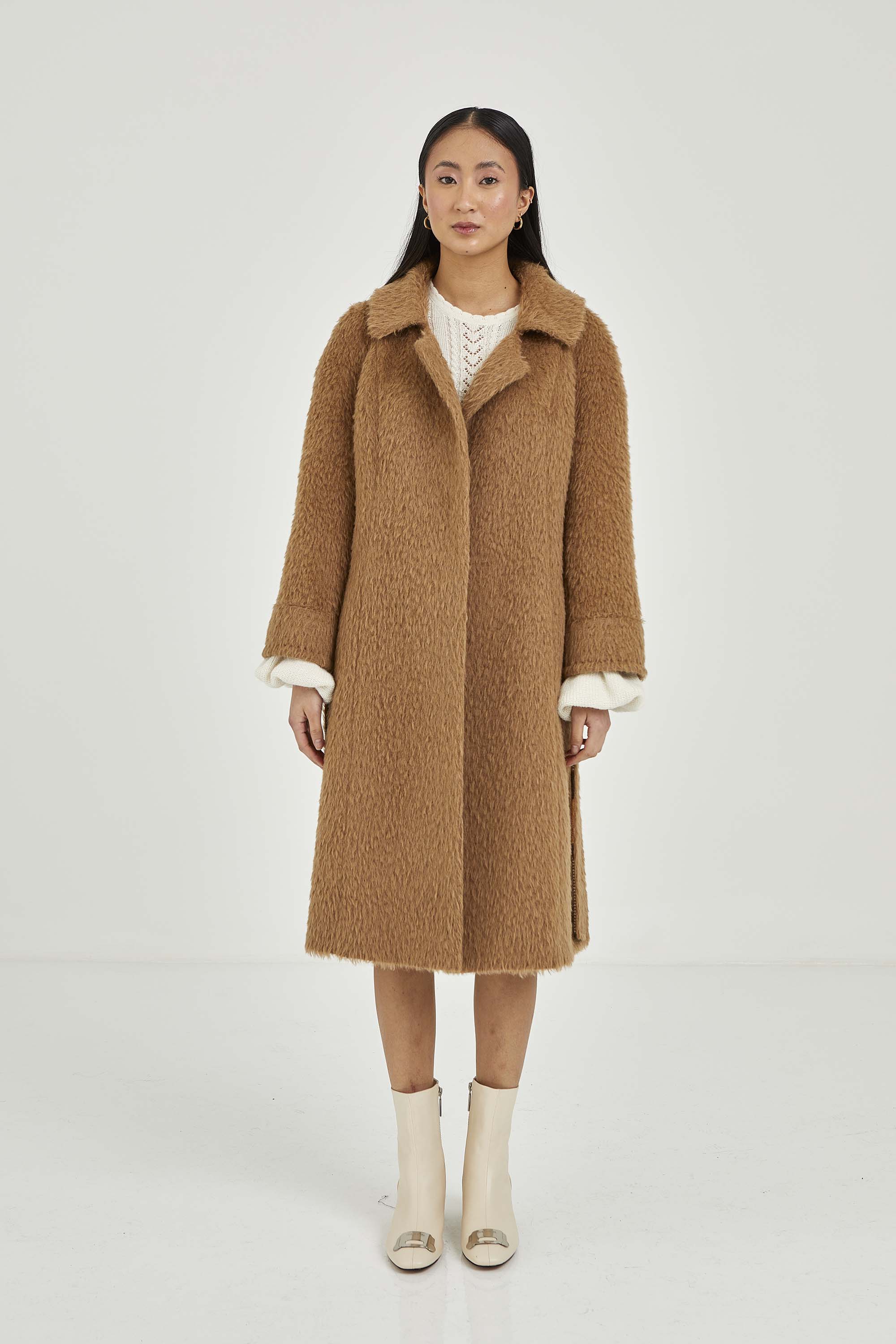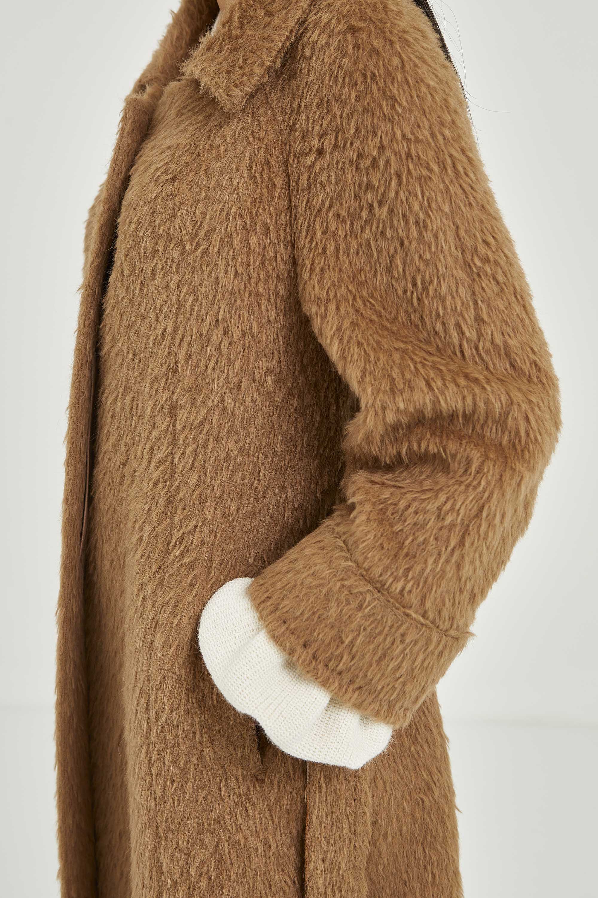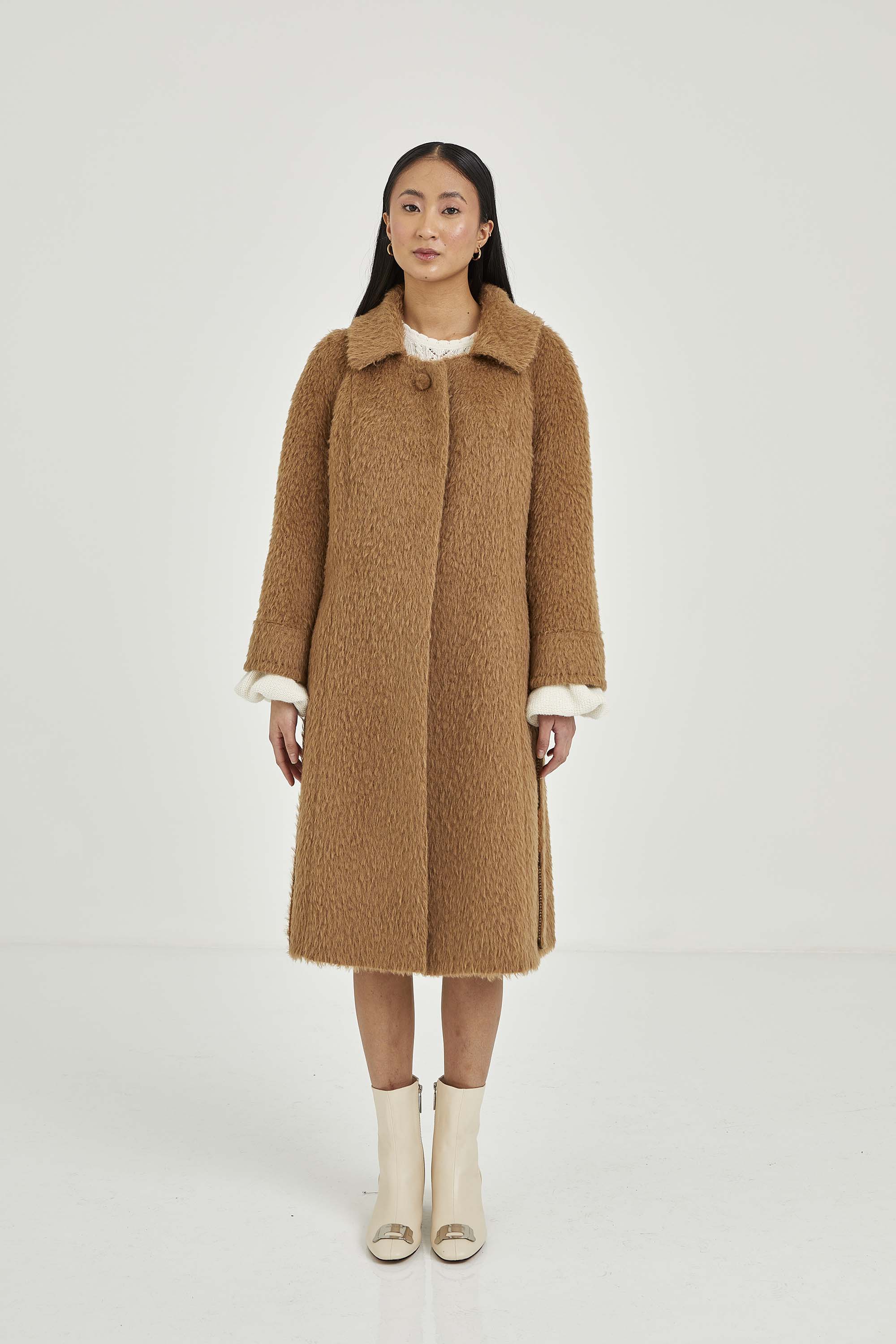 Coat made of long-haired suri alpaca. The model has hidden buttons and a visible button on the collar to show off a closed collar with short lapel. The sleeves have hand-stitched details.