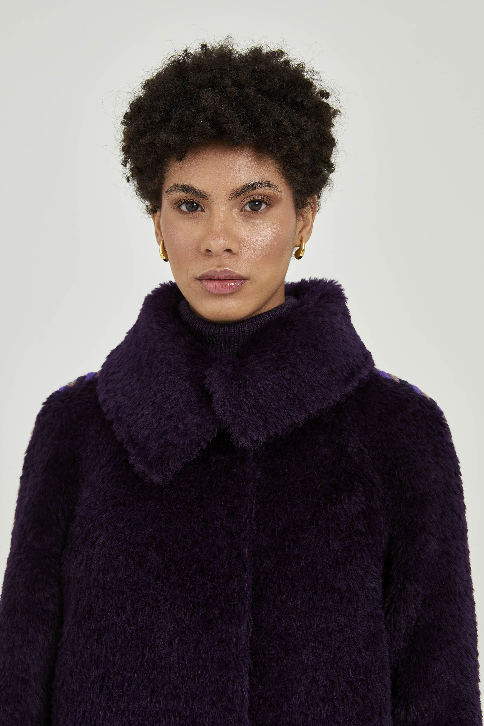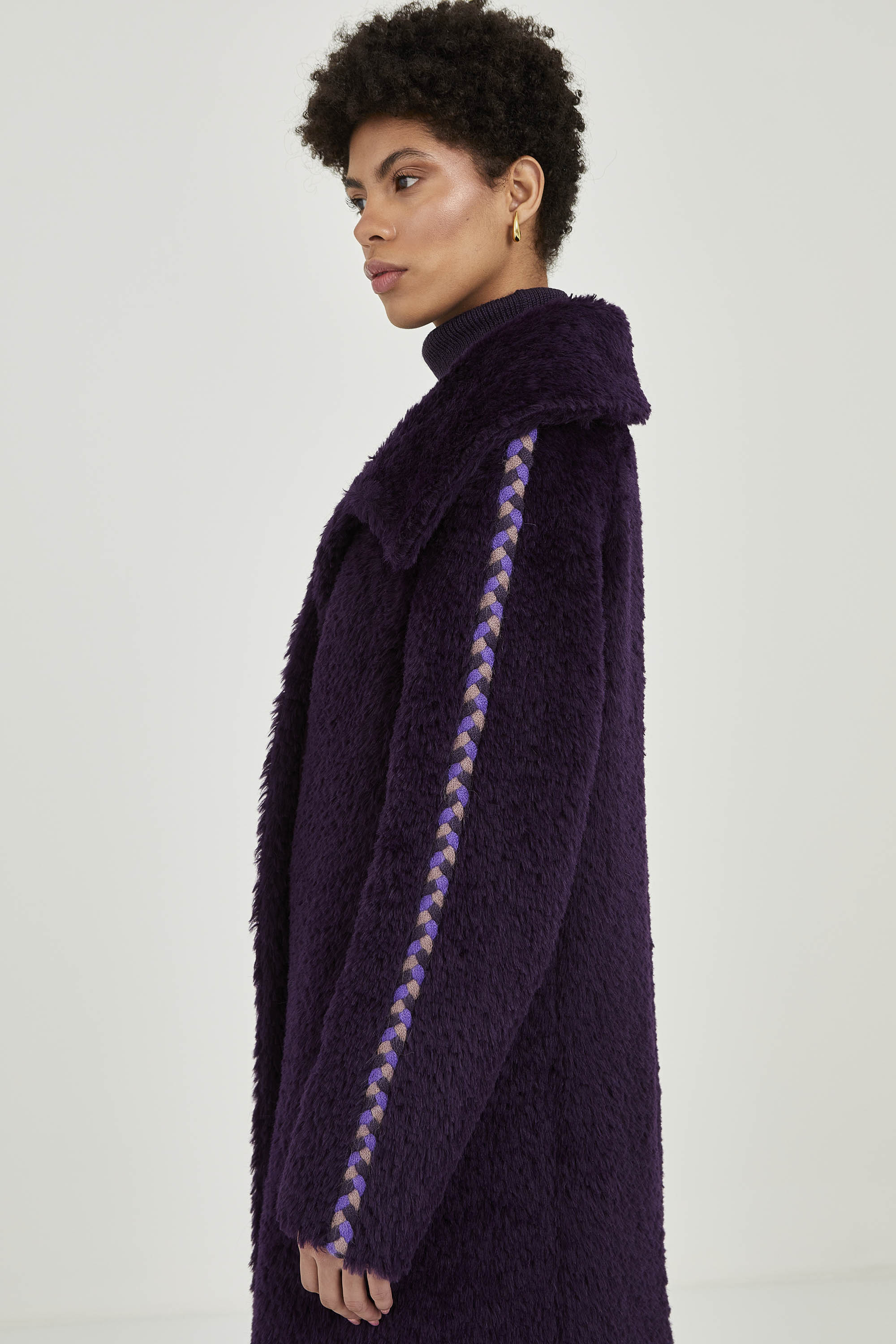Unique piece crafted in suri alpaca long hair. The collar is versatile, can be worn open or with an asymmetrical closure. It includes handmade artisan braid details on the sleeves. Ideal for cold days in the city.