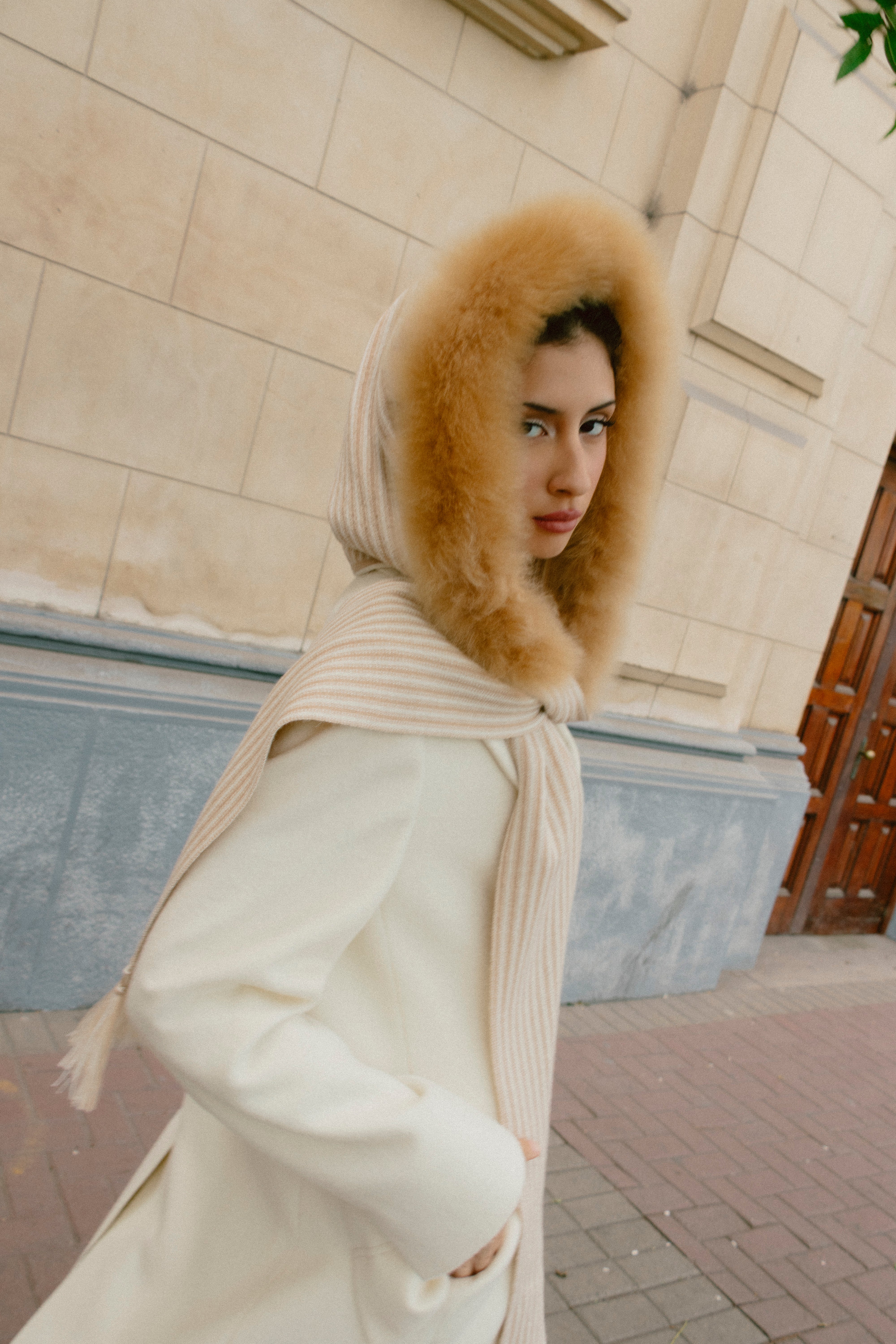 Knitted scarf crafted in 100% baby alpaca with delicate lines that create texture and movement. The fine-knit base is complemented by natural baby alpaca fur, offering exceptional warmth and a minimalist luxury finish.