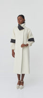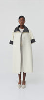Grecia coat, a limited-edition piece with a versatile collar, short sleeves, and the designer’s signature seal on the sleeve, a proposal defined by strong identity.